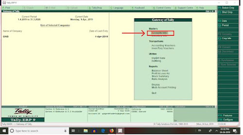 सबसे पहले आप कंपनी ओपन करिये इसके बाद आप एकाउंट्स इन्फो (Accounts